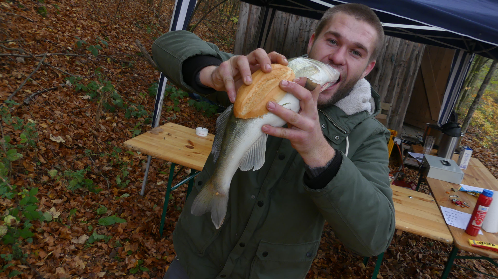 Vorstandsmitglied Tobias Lorenz fing am Ende sogar noch einen Zander, den er ob seines Heißhungers sofort als Fischbrötchen mit Kammschuppen und Fischgräten verschlang (siehe Bilder untenstehend).